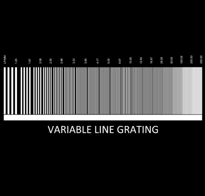 LBTEK可变线栅分辨率范围从1.25 lp/mm到250 lp/mm。该测试靶主要用来确认光学系统的分辨率,可全面分析整个频率范围而不是只测出其最高线对。分辨率测试靶包含正(明场)、负(暗场)分辨率测试靶。正分辨率测试靶是在钠钙玻璃基底上镀铬,使非图案部分透光。负分辨率测试靶则是在基底上镀铬,使图案部分透光。如有其它定制需求,请联系技术支持。
