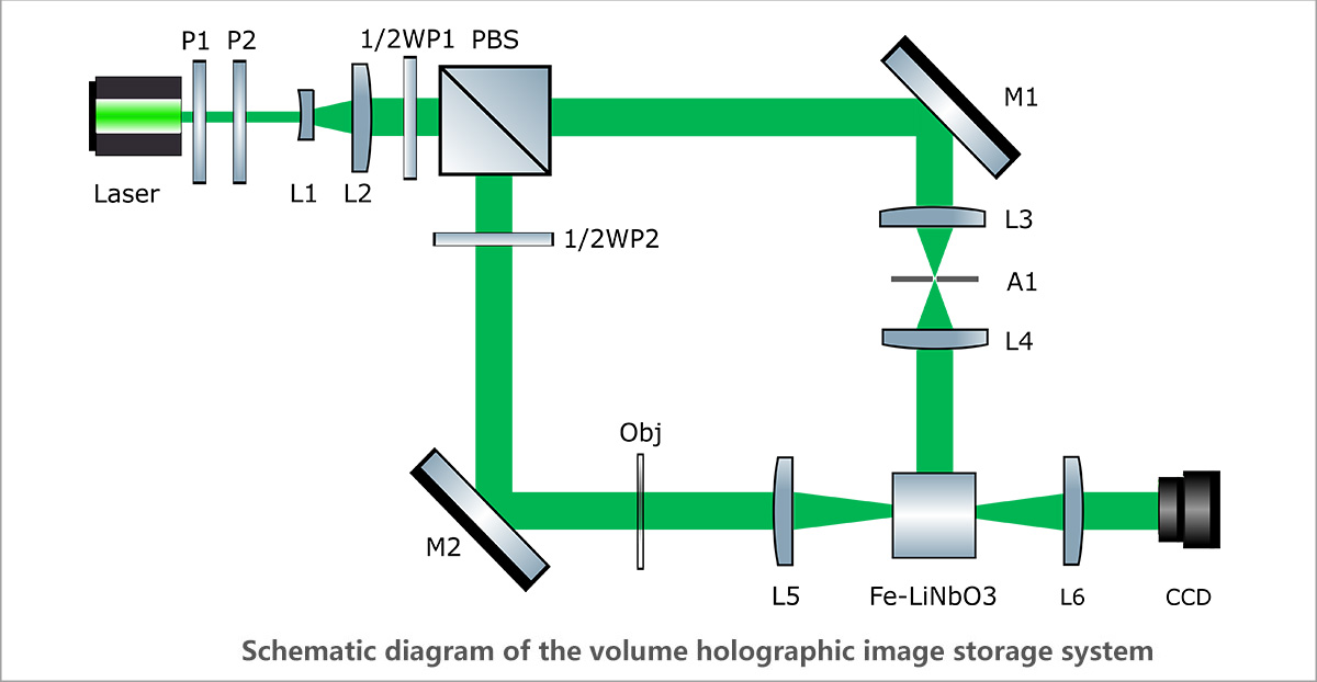 LBTEK 体全息存储实验采用的是角度复用方法实现对序列图像进行存储。携带待存储的图像信息的光通常叫做信号光,另一束参考光与该信号光发生干涉,利用记录介质(光折变晶体或光聚合物)的光折变效应形成体全息图,完成信息存储。通过调节光路角度,参考光经过4f系统后,在存储晶体内部不同角度和位置形成对应的干涉全息图,可以实现在晶体介质中的角度复用存储。再现读取时,则是利用了光的衍射原理,采用和原来相同的参考光寻址,即可再现存储在介质中的物信息。