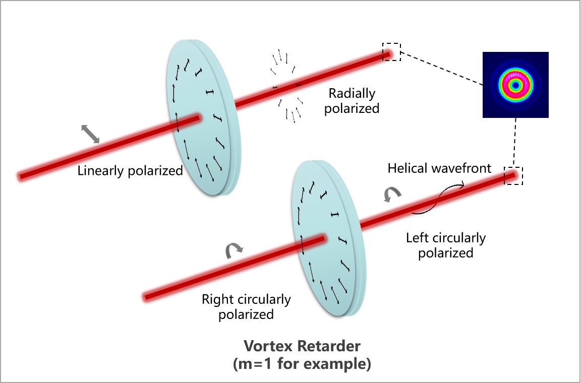 LBTEK m=1涡旋波片的液晶分子快轴取向沿基片角向在360 °圆心角内转动了180 °,线偏振光下形貌如右图所示。m=1涡旋波片适用于尺寸在Ø1 mm到Ø12 mm之间的入射光,转换效率≥99.5 %。圆偏振光入射时,能够生成l=±1的拉盖尔-高斯光束;线偏振光入射时,能够生成矢量偏振光束,其中包括径向偏振光束和角向偏振光束两种特殊情况。所选取的涡旋波片阶数m越小,则光束中心孔尺寸越小。涡旋波片的标准SM1透镜套筒外壳上,标注了产品的名称、型号,并用4条刻线标记了涡旋波片的中心点;同时,基于m=1涡旋波片的快轴敏感特性,用1个圆点标记了其0 °快轴。