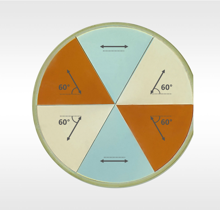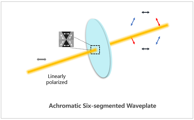 LBTEK 消色差六分区波片能够实现某一波段内不同区域入射光偏振态的不同改变,线偏振光经过消色差六分区波片各个区域后,产生的光程差为λ/2,相位延迟为π。其安装于标准SM1透镜套筒中,套筒表面上刻有产品型号及快轴0°区域标识线,方便用户快速识别使用。