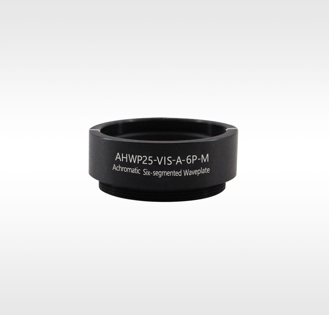 LBTEK 消色差六分区波片(Achromatic Six-segmented Waveplate)采用N-BK7玻璃基底和液晶聚合物(Liquid Crystal Polymers,LCP)材料,由3层液晶真零级六分区波片以一定角度设计组合而成。单层LCP薄膜中每个区域的液晶分子快轴取向一致,3层LCP薄膜按照设计角度各个区域对应叠加构成消色差六分区波片的整体快轴取向,通过控制每层液晶聚合物薄膜的膜层厚度及每个对应区域的相对快轴角度来控制各个区域总体的延迟量。LBTEK消色差六分区波片常用于实现不同区域入射光偏振态的不同变化,其具有近似真零级特性,支持大入射角,对波长和温度变化敏感度较低。与真零级六分区波片相比,不限制于特定工作波长,可在某一波段范围内对不同入射区域光束实现不同的偏振态改变。标准消色差六分区波片的设计波长为400-700 nm,延迟量为λ/2,安装于标准SM1透镜套筒中,套筒表面刻有产品型号及波片0°快轴区域标识线,方便客户辨别和使用。