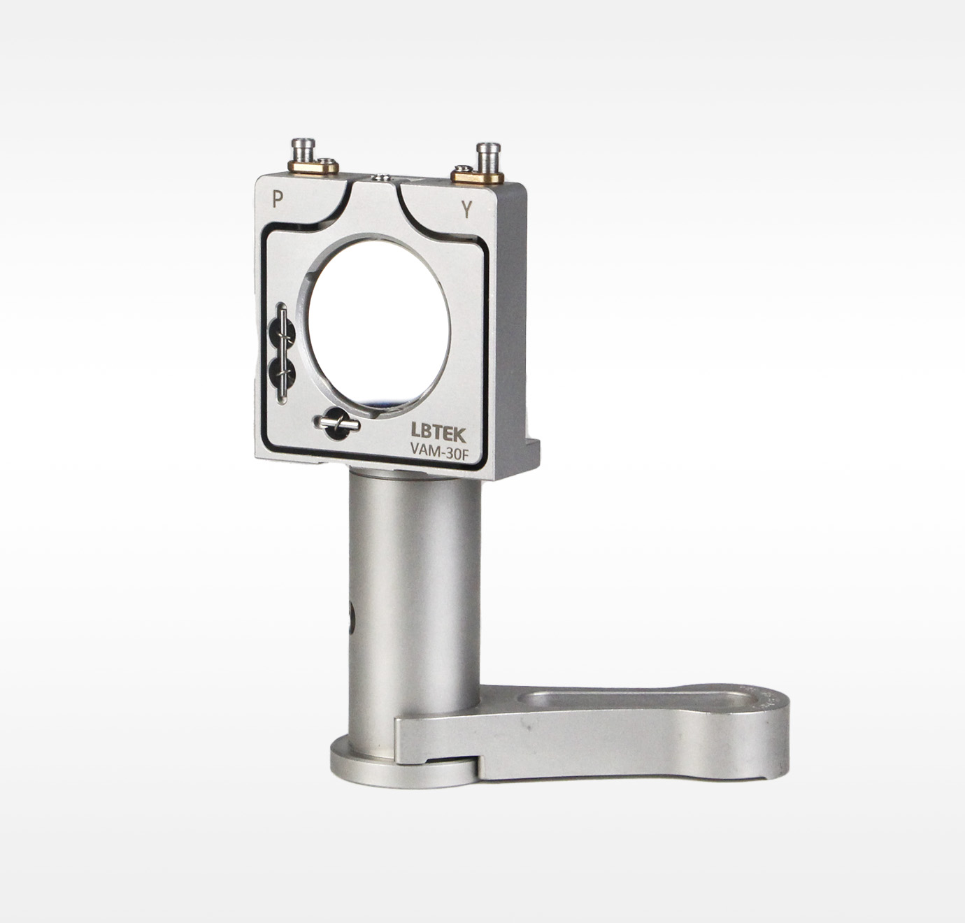 LBTEK Ø30 mm不锈钢垂直调节调整架,主体结构为不锈钢材质,设计稳定且紧凑,可安装最小厚度3 mm、直径30 mm光学元件,胶头螺钉固定光学元件。其调节角度为±2.5°,调节精度俯仰/偏摆分别为:0.3°/转和0.21°/转。2个M4×0.25螺纹副带锁紧铜板,可用附送的带旋钮的2 mm内六角扳手HWS-2或者普通2 mm六角扳手调节。两个调节器都标记有它的运动轴; P表示俯仰,Y表示偏摆。底座带3个Ø4.4 mm通孔,可用附送的M4圆柱头内六角螺钉将调节架安装在接杆上。并且在底座背面具有额外的用于固定安装位置的Ø2 mm定位销孔。