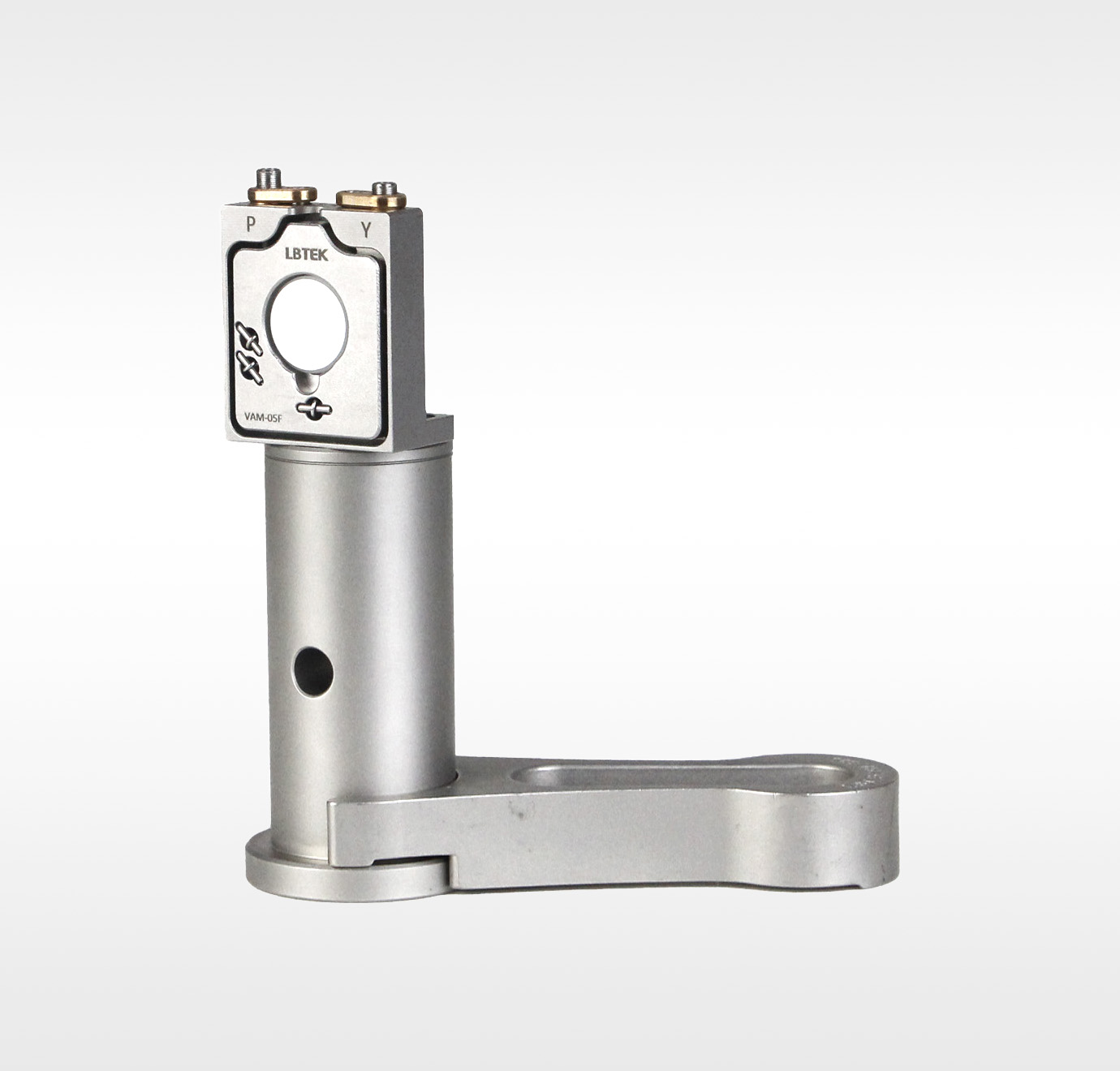 LBTEK Ø12.7 mm不锈钢垂直调节调整架,主体结构为不锈钢材质,设计稳定且紧凑,可安装最小厚度1.5 mm、直径12.7 mm光学元件,胶头螺钉固定光学元件。其中VAM-05F从正面安装光学元件,VAM-05B从背面安装,可以确保无论其厚度如何,光学元件的前表面都位于同一安装位置。两款安装架的调节角度为±2.5°,调节精度俯仰/偏摆分别为:0.52°/转和0.46°/转。2个M3.5×0.25螺纹副带锁紧铜板,可用附送的带旋钮的1.5 mm内六角扳手HWS-1.5或者普通1.5 mm六角扳手调节。两个调节器都标记有它的运动轴; P表示俯仰,Y表示偏摆。底座带3个Ø4.3 mm通孔,可用附送的M4圆柱头内六角螺钉将调节架安装在接杆上。并且在底座背面具有额外的用于固定安装位置的Ø2 mm定位销孔。
