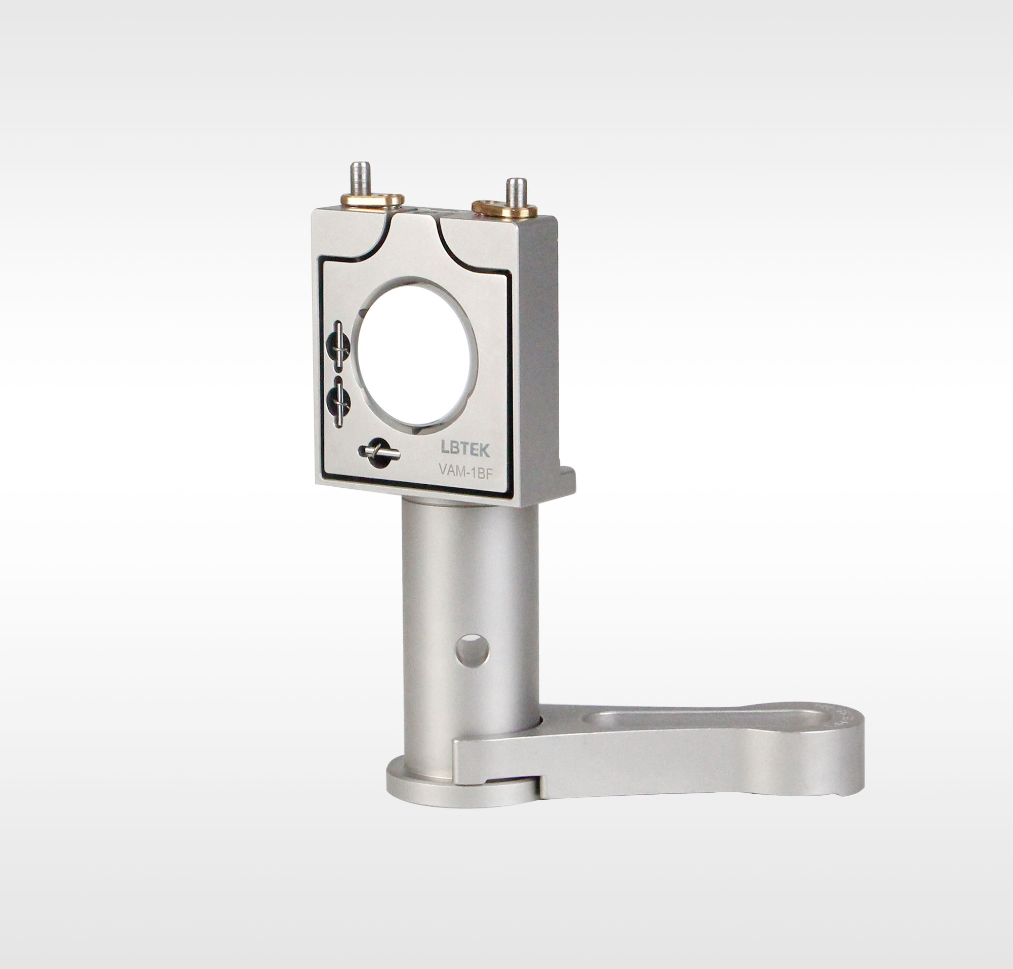 LBTEK Ø25.4 mm不锈钢垂直调节调整架,主体结构为316L不锈钢材质,设计稳定且紧凑,可安装 Ø25.4 mm光学元件。其中VAM-1BF从正面安装最小厚度3 mm光学元件,胶头螺钉固定;VAM-1BP从正面安装最小厚度3 mm光学元件,胶头螺钉和压片双重固定;VAM-1BB从背面安装最小厚度3 mm光学元件,胶头螺钉固定;VAM-1AF2从背面安装最大厚度3.8 mm光学元件,卡环固定;背面安装光学元件的调节架可以确保无论光学元件厚度如何,其前表面都位于同一安装位置。调节架的调节角度为±3.0°,调节精度俯仰/偏摆分别为:0.28°/转和0.24°/转。2个M4×0.25螺纹副带锁紧铜板,可用附送的带旋钮的1.5 mm内六角扳手HWS-1.5或者普通1.5 mm六角扳手调节。底座带3个M4安装通孔,可用附送的M4圆柱头内六角螺钉将调节架安装在接杆上。并且在底座背面具有用于定位安装的Ø2 mm定位销孔。