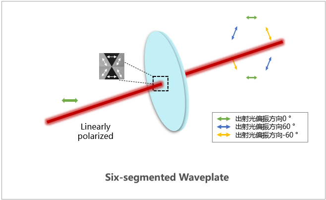 LBTEK真零级六分区波片制作于N-BK7窗口片上,双层衬底,在整个通光孔径内具备相同的相位延迟量,即为工作波长的λ/2。真零级六分区波片安装在黑色阳极氧化的标准SM1套筒中,套筒上刻有产品型号及规格描述,端面刻有一条竖线和一个点,竖线为60°快轴与-60°快轴区域的分界线,点所在的区域为60°快轴对应的区域。按照逆时针方向分析,以点对应区域为起始点,相邻扇形区域之间快轴夹角依次为30°、30°、120°、30°、30°、120°。