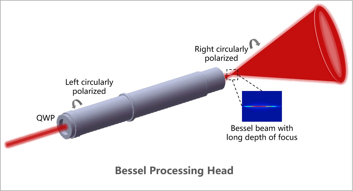 LBTEK 工作波长λ为1064 nm的折射型贝塞尔加工头适用于单模激光,全部采用高损伤、高透过率的光学元件集成。具有工作距离长,高透过,高能量利用率等特点,可实现小崩边、小热影响区域、无锥度的切割效果。空气焦深可定制。