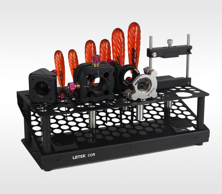 LBTEK 台面整理架提供一个暂时的区域来存放安装好的光学元件,如光学接杆上的光学组件,便于工作台面的整理与收纳。台面为钣金材质,厚度1.5 mm,质轻紧凑,立柱为铝合金材质棒料,为整理架提供刚性,脚垫为POM材质,具有良好的耐磨性和自润滑性。其表面作喷砂氧化发黑处理,可减少表面反射对光学系统的影响。台面带两种规格的安装孔,小孔直径12.8 mm,适用于Ø12.7 mm光学接杆,孔间距为15.5 mm,大孔直径33 mm,适用于滴瓶。