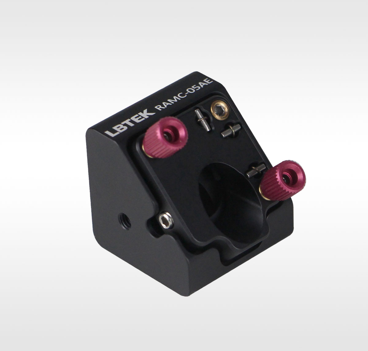 LBTEK 16 mm同轴系统直角反射镜架适用相对于光轴45°安装反射镜,适合搭建紧凑型系统。入射和出射端面均带有一个SM05螺纹孔,可兼容SM05透镜套筒,斜面用于安装Ø12.7 mm最小厚度3 mm光学元件,侧边胶头螺钉固定。入射端面和出射端面相互垂直。斜面带三个调节器,可实现±4º俯仰和倾斜角度调节、±1 mm线性位移调节。其中两个调节器带旋钮,第三个调节器末端带内六角孔,三个调节器均可用2 mm六角扳手进行调节。入射/出射端面可安装Ø4 mm同轴接杆,用于同轴系统;两侧面一面带有一个M4螺纹孔,另一面带有一个M3螺纹孔,可安装光学接杆,用于自由空间。