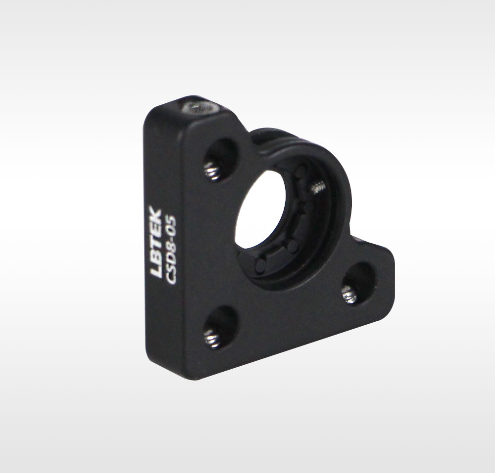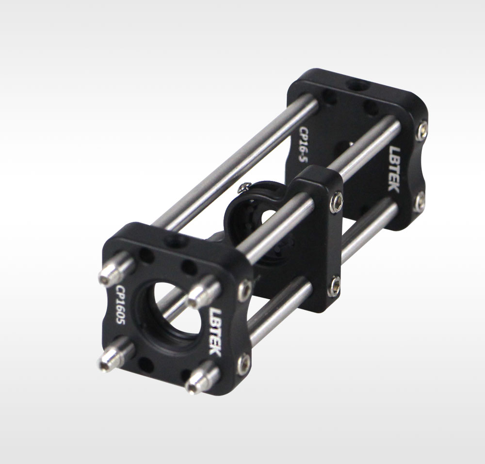 LBTEK 提供的16 mm同轴可变光阑兼容16 mm同轴系统。外壳安装板采用铝合金材质,黑色阳极氧化工艺,能有效限制光反射;同时安装板采用薄款设计,厚度5.7 mm,有利于节省空间;安装板上有三个Ø4 mm孔,兼容Ø4 mm同轴接杆,侧面带M4紧定螺钉可用2 mm六角扳手调节锁紧。