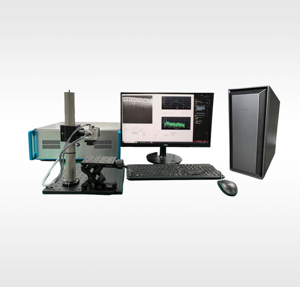 LBTEK 谱域OCT教学系统主要是由一个OCT引擎、一台高性能计算机、一个扫描系统以及一套预装的软件组成。系统基于迈克尔逊干涉仪,采样中心波长840 nm波段的超辐射发光二极管(SLD)作为光源,光源输出的探测光经过光纤耦合器分成两路光。一路光进入样品臂后经准直器准直成平行光,平行光通过二维扫描振镜和聚焦透镜实现对样品的二维扫描,经过样品反射(或背向散射)后返回原光路;另一路光进入参考臂经过准直器、透镜和反射镜后原路返回。样品臂和参考臂的光在耦合器处汇合,其干涉光谱信号经光谱仪进行探测,最后经计算机完成图像重构。