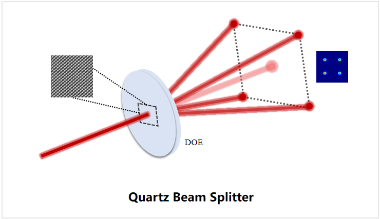 LBTEK 石英分束DOE是一种基于紫外熔融石英材质制成的衍射光学元件,通过对相应衍射级次的能量进行分配来实现预期分束效果。根据预期的分束模式、分束光斑间隔或光束分离角度等需求,基于衍射光学原理设计得到其相位,最后利用表面浮雕工艺引入设计相位结构从而实现预期的光束分束。基于石英分束DOE高分束均匀性、高分离角精度等优点,其可用于并行激光加工、光传感探测、光医疗美容等众多应用方向中。相较于液晶聚合物,紫外熔融石英具有低吸收的特性,更易兼容紫外波段下的应用场景。LBTEK提供工作波长为355 nm的石英分束DOE标品,分束模式有1×2和2×2可选。除标准产品外,LBTEK 还支持参数规格的灵活定制,具体定制需求,请联系LBTEK 技术支持。